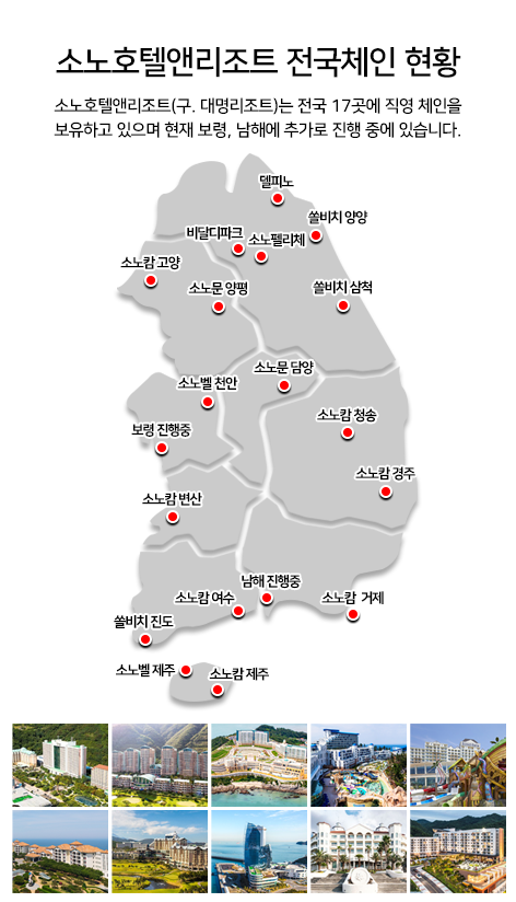 대명리조트는 전국 17 지역에 체인을 두고 있습니다. 워낙 다양한 곳에 자리하고 있다보니 여행시 숙박이 참 편합니다. 어디를 가던 지 대명리조트가 있기에 그 곳을 관광하고 여행한 후 숙박에 와서 편히 쉴 수 있죠. 또한 리조트 내에는 다양한 부대시설를 갖추고 있어 휴식을 즐기며 즐거움도 함께 누릴 수 있는데요.