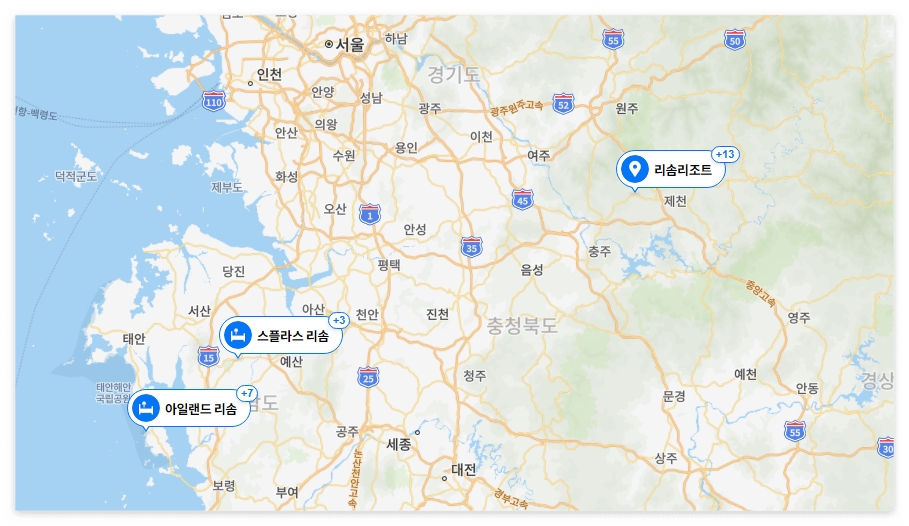 호반그룹에서 운영을 하고 있는 리솜은 제천, 덕산, 안면도에 체인을 두고 있어요. 그리고 체인마다 특색이 다 다르죠. 제천은 산속에 자리하고 있어 고요한 자연을 만끽하며 힐링할 수 있고 덕산은 워터파크와 온천이 있어 시원하게 물놀이를 할 수 있구요. 그리고 안면도는 서해 바다 바로 앞에 자리하고 있어 멋진 오션뷰를 감상하며 여행을 즐길 수 있답니다.