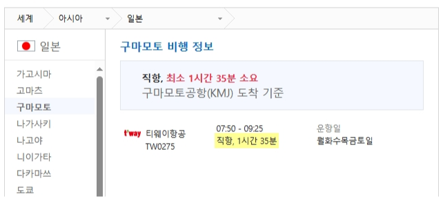 | 인천 - 구마모토공항 | 매일 운항 |