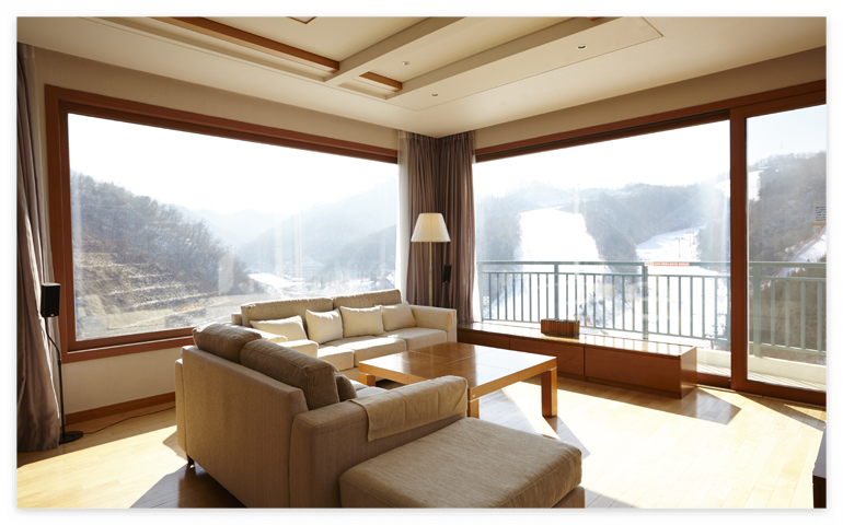 - 엘스위트콘도는 시원한 스키장 뷰가 펼쳐지는 콘도로 패밀리, 디럭스, 스위트 3가지 객실이 준비되어 있습니다. 검봉산의 멋진 풍경과 북한강의 아름다운 정취를 즐길 수 있으며 겨울에는 스릴넘치는 스키도 즐길 수 있답니다.