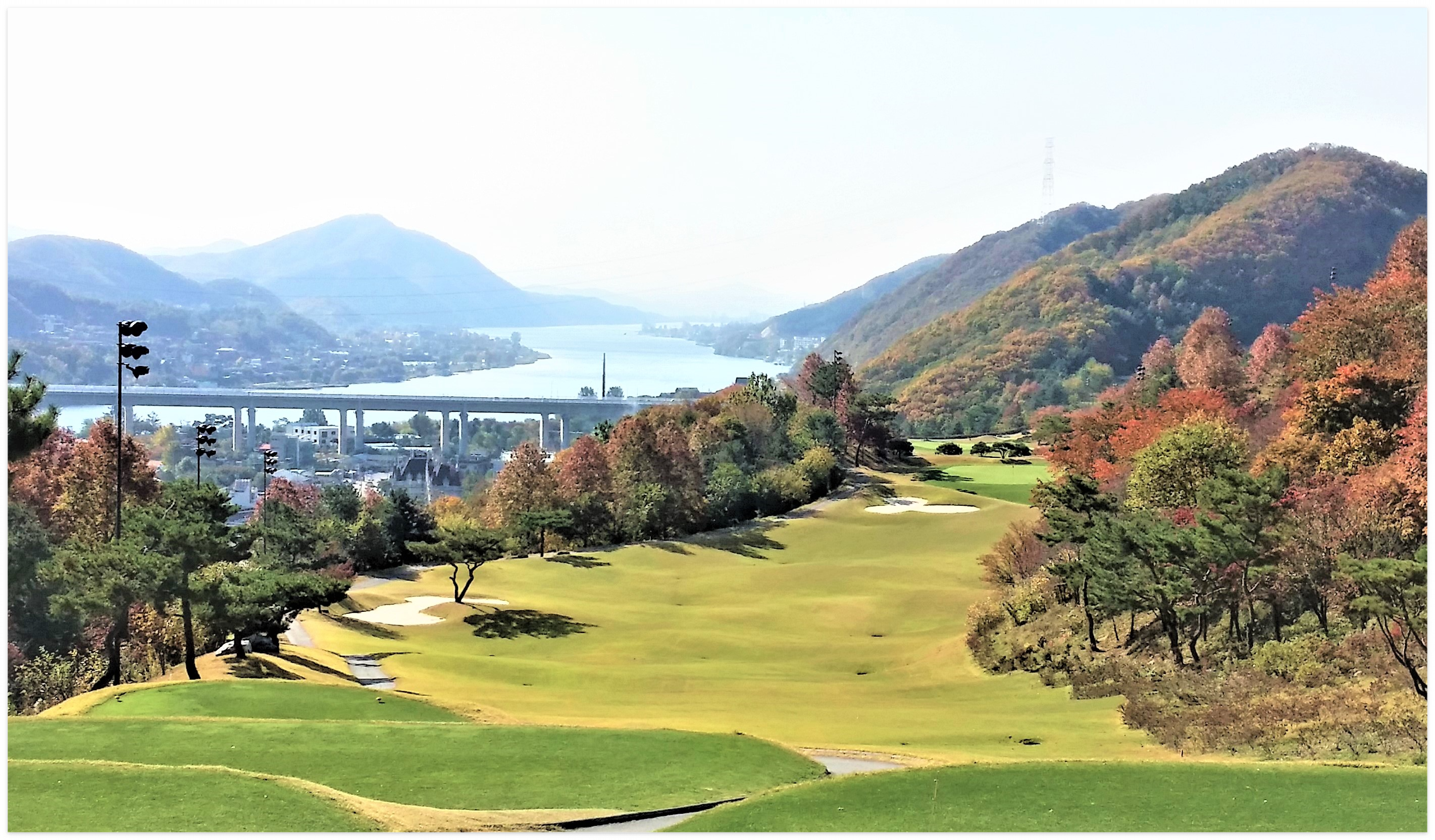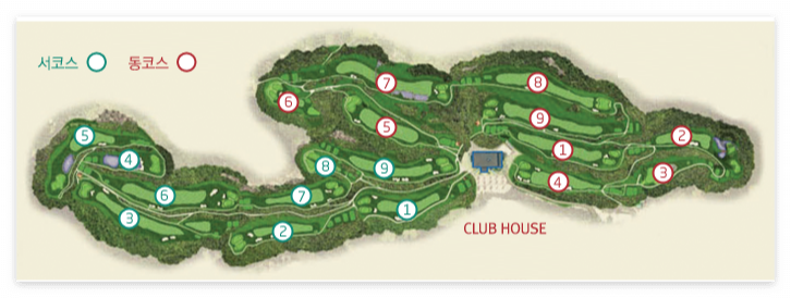 전장이 6,881yd의 18홀 규모로 코스 면적이 333,555평으로 넓고 쾌적한 코스입니다. 코스 중에서 가장 높은 곳은 동7번홀의 티잉 그라운드로 해발 202미터이고 제일 낮은 곳이 해발 73미터로 서2번홀입니다. 고저차가 심한 골프장으로 다른 골프장에서는 경험할 수 없는 샷의 재미를 볼 수 있는데요. 특히 밑으로 쭉 뻗어있는 코스 끝으로는 수려한 북한강의 경치가 배경이 되어 멋진 코스뷰를 보며 힐링 골프를 즐길 수 있습니다.