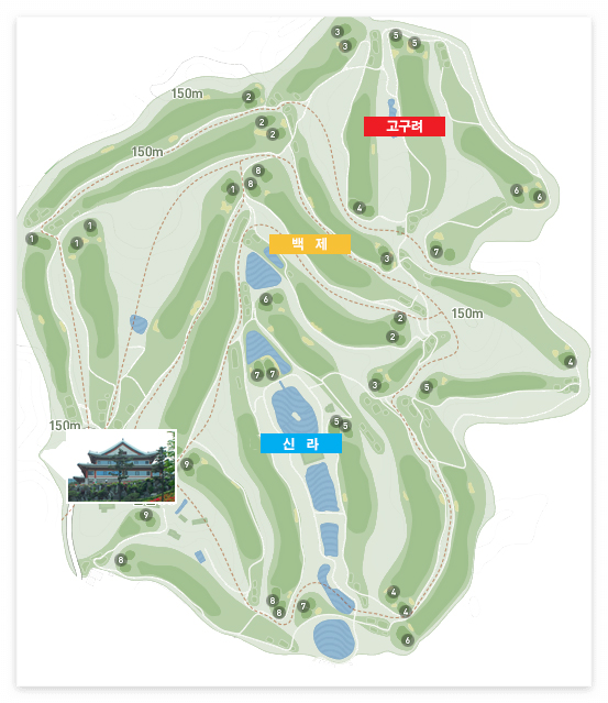 한원cc회원권 코스는 이렇게 세가지로 구분되어 있습니다. 굉장히 한국적인 코스명이데요. 고구려는 광할하고 넓은 코스로 여유있는 샷을 즐길 수 있고 백제는 평탄한 코스로 아기자기한 맛도 있습니다. 신라는 블라인드 홀이 많아서 나름 생각을 많이 해야하는 홀이구요. 전반적으로 코스가 쉽지 않게 구성되어 있지만 전장이 짧다는 점과 벙커 또한 쉬운 쪽에 속해서 크게 부담이 되는 코스는 아니라 할 수 있습니다.
