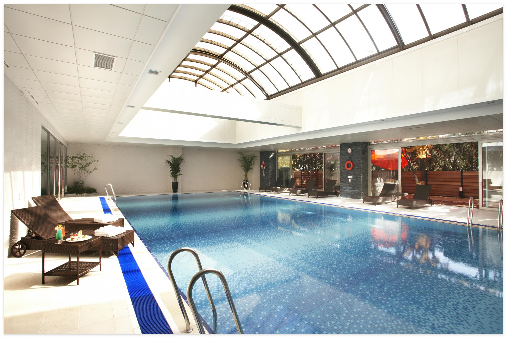 수영장, 돔형태로 되어 있어 천정이 유리라 자연 채광이 그대로 들어오는 수영장입니다. 그리고 돔이 열리면 야외 풀장처럼 이용이 가능하구요. 야외 스파도 마련되어 있어 수영 중간에 힐링하며 쉬는 타임도 가질 수 있습니다.